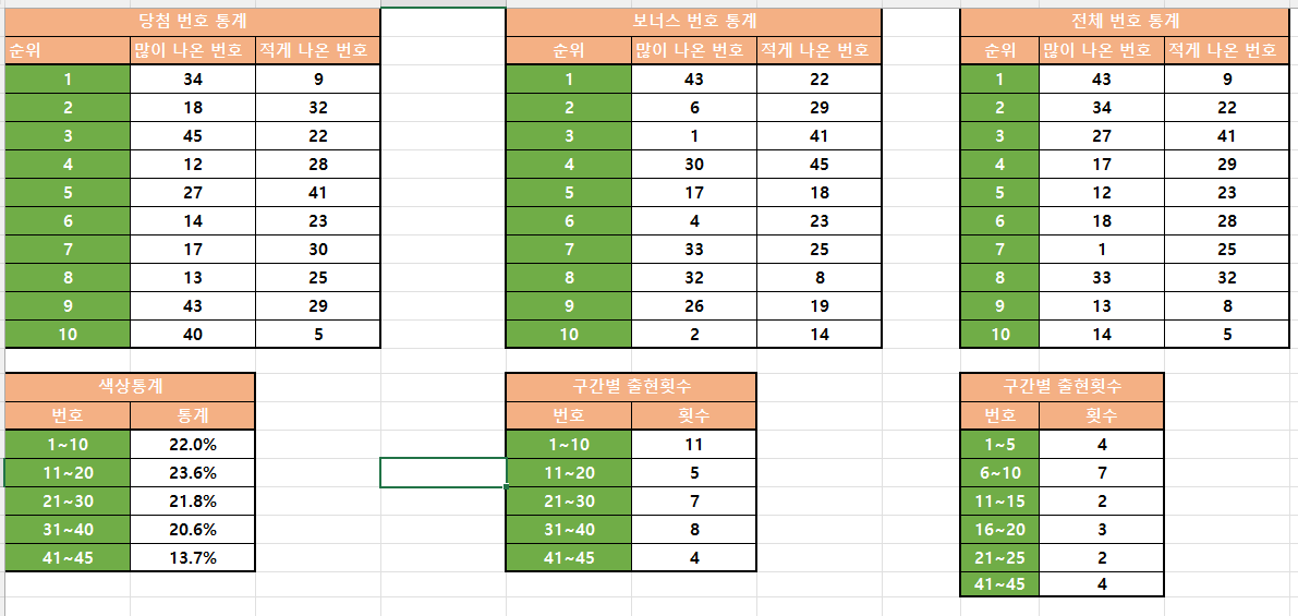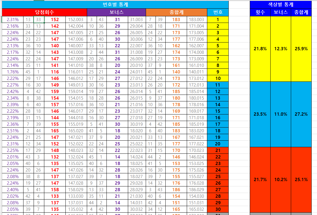 엑셀 메인시트에 이전보다는 복잡하지 않게 다른 시트로 옮기고 하면서 간단하게 어떤 부분이 당첨확률이 높은지 간단하게 볼수 있는 통계부분만 남겨 놨습니다
